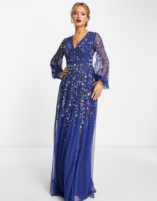 ASOS DESIGN floral embellished maxi dress with flared cuff detail in navy