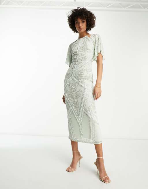 Asos light green clearance dress, ASOS DESIGN Tall embellished floral flutter sleeve halter midi dress in light green clearance