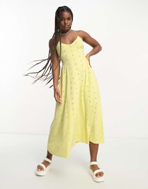 ASOS DESIGN broderie strappy back detail midi dress with seam detail in lemon