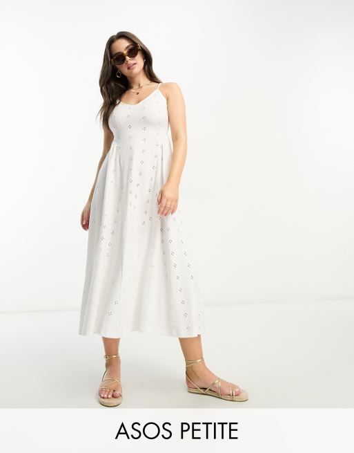 ASOS DESIGN Petite broderie strappy back detail midi dress with seam detail in white