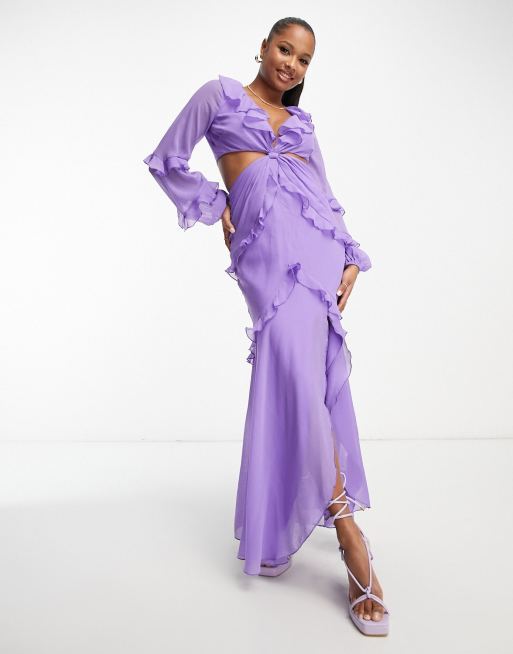 ASOS DESIGN Petite twist waist cut out maxi dress with ruffle detail in purple