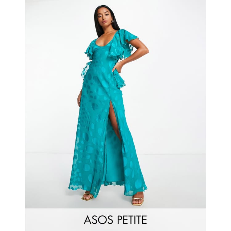 ASOS DESIGN Petite satin spot flutter sleeve maxi dress with open back in deep aqua