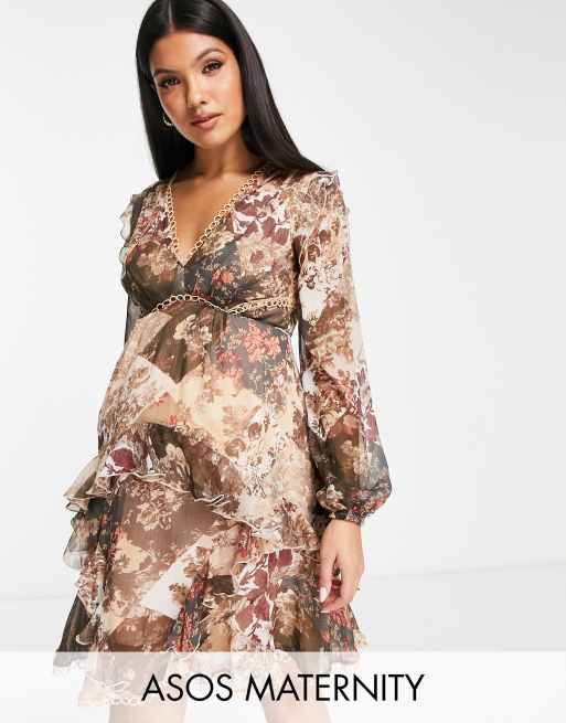ASOS DESIGN Maternity long sleeve mini dress in floral print with cluster embellishment detail and circle trims