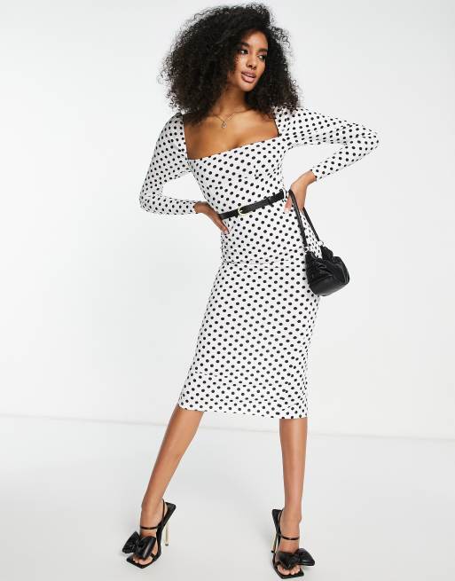 ASOS DESIGN square neck midi dress with belt in mono polka dot