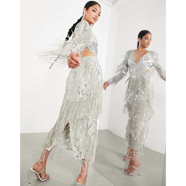 ASOS EDITION geo embellished fringe plunge midi dress in silver