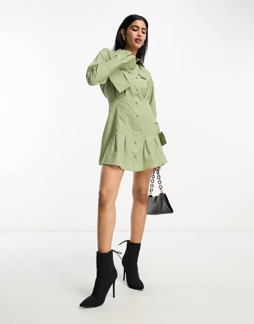 Asos green shirt clearance dress, ASOS DESIGN utility mini shirt dress with nipped in waist and pocket detail in khaki clearance