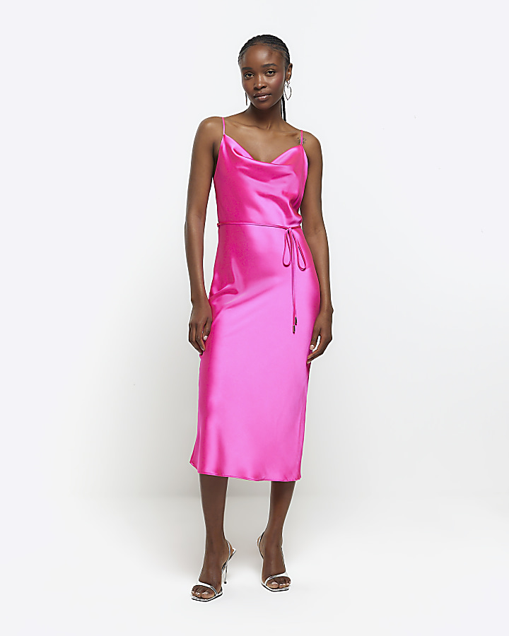 Cowl neck slip clearance dress midi, Pink satin cowl neck slip midi dress River Island clearance