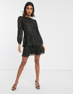 Warehouse foil spot clearance dress, Warehouse tiered metallic gold spot dress in black ASOS clearance