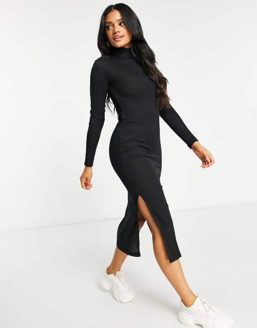 NA KD ribbed high neck side slit midi dress in black