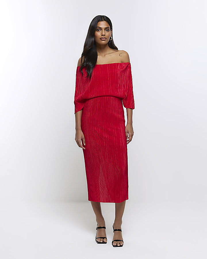 Red bardot midi clearance dress, Bardot Pleated Midi Dress In Red New In from Yumi UK clearance