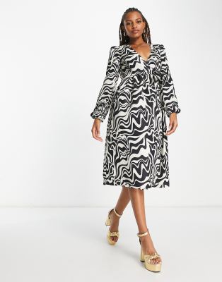 Monki abstract print puff sleeve midi dress in multi