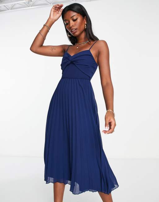 ASOS DESIGN twist front pleated cami midi dress with belt in navy