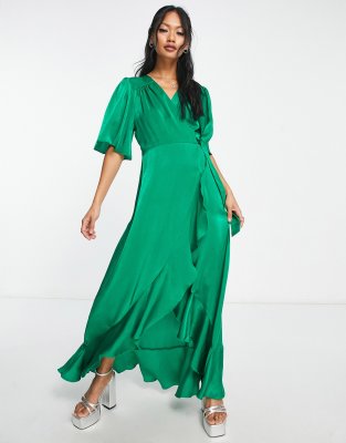Flounce London satin flutter sleeve wrap front maxi dress in bold green
