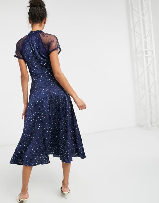 Liquorish a line lace detail midi dress in navy spot ASOS