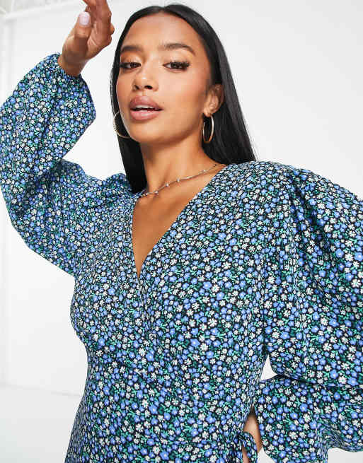 Glamorous Petite wrap dress with tie waist in blue ditsy floral ASOS