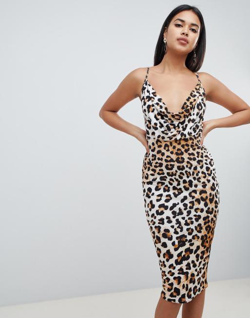 ASOS DESIGN slinky midi bodycon dress with cowl neck in leopard print