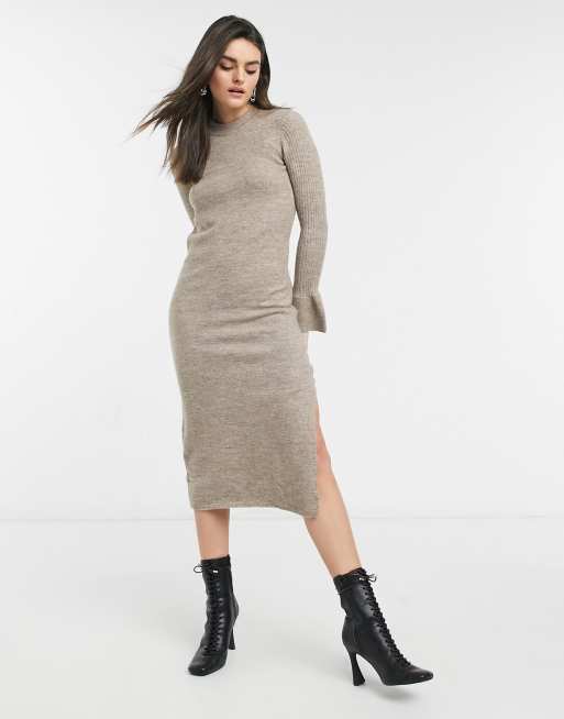 ASOS DESIGN knitted dress with bell sleeve detail in taupe