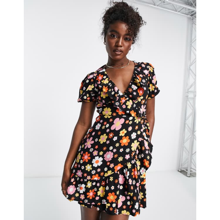 Miss Selfridge frill wrap mini tea dress in black retro floral