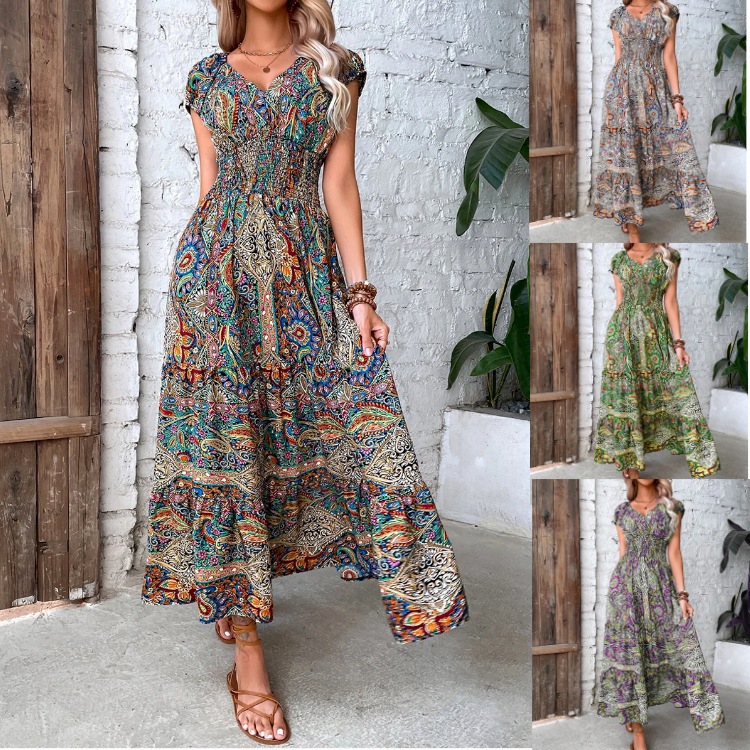 Estoque Pronto Mulher Vintage Print Long Dress 2023 Summer Sexy V Pesco o Curto Manga Em Vestido Feminino Elegante El stico Cintura Maxi Dresess