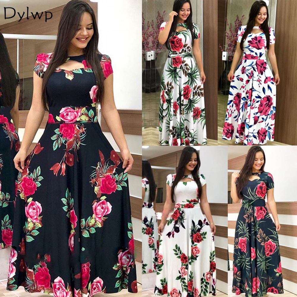 5XL Plus Tamanho Mulher Vestido Longo Flor Impress o maxi High Waist Short Sleeve Party Dress
