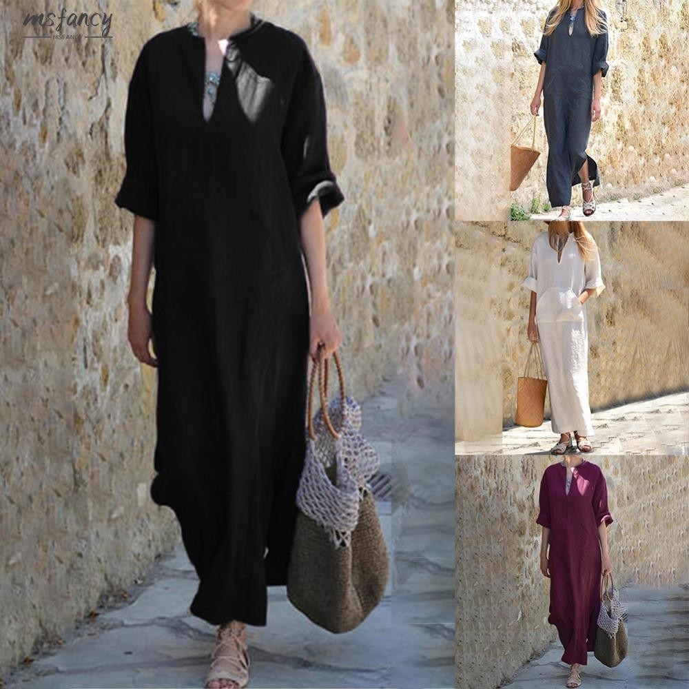 Plus Size Women s Cotton Linen Maxi Dress with Pockets Elegant Design Wine Red