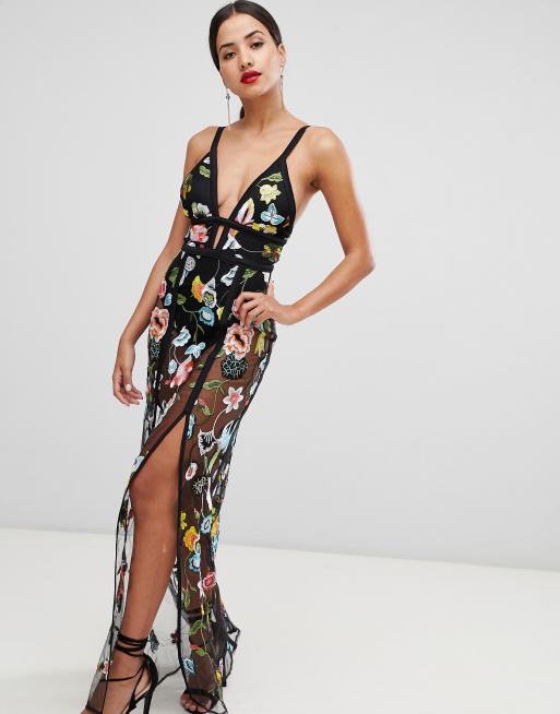 Sheer embroidered maxi clearance dress, Embroidered Floral Sheer Sleeved Maxi Dress in Blue Chi Chi London clearance