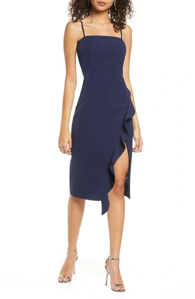 NEW BARDOT Navy Blue Carmelle Ruffle High Slit Midi Sheath