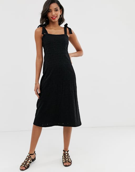 Sundress with tie clearance straps, ASOS Tie Strap Clean Broderie Midi Sundress in Black Lyst clearance