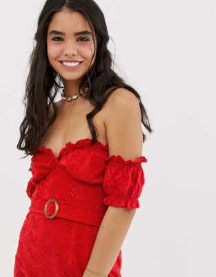Asos design bardot mini broderie clearance sundress with faux tortoiseshell belt