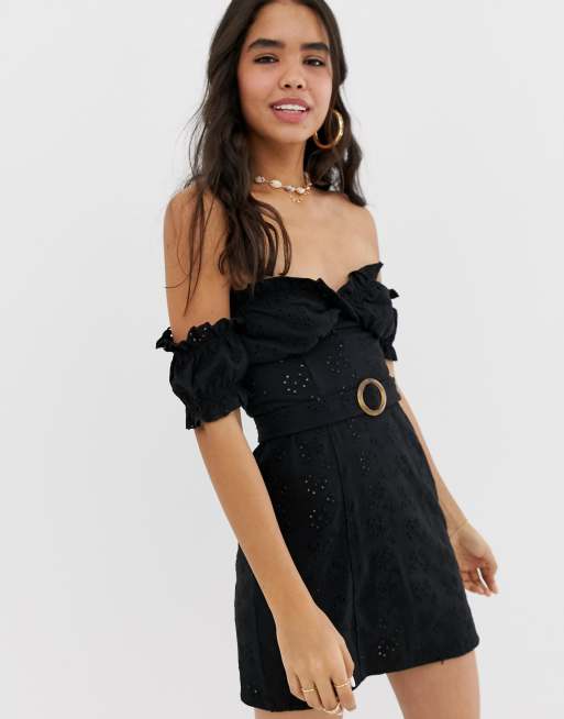 Asos design bardot mini broderie clearance sundress with faux tortoiseshell belt, ASOS DESIGN pleated bardot mini dress in black clearance