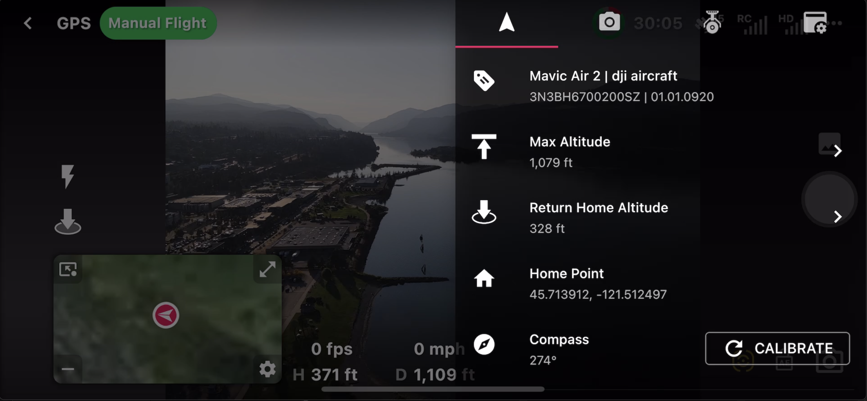 Mavic air controller clearance calibration, Flight Dashboard Menu Drone Settings Max Altitude RTH clearance