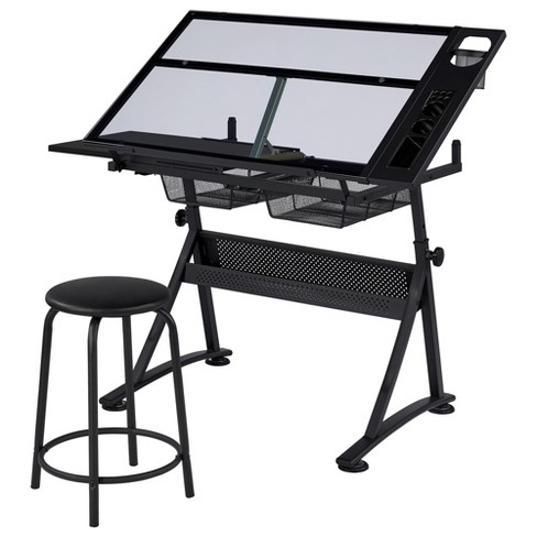 Yaheetech Adjustable Glass Drafting Table Stool Set Black Target