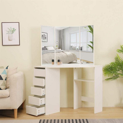 Corner Vanity Table Set with Three Fold Mirror Makeup Desk with 4