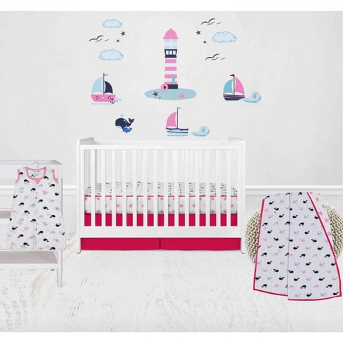 Blue and pink clearance crib bedding, Bacati Girls Nautical Muslin Whales Boat Pink Blue Navy 4 Pc clearance