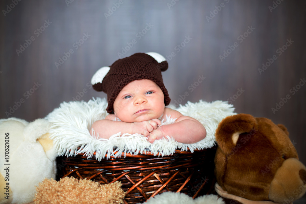 Cute newborn baby boy in basket with teddy bear hat looking at