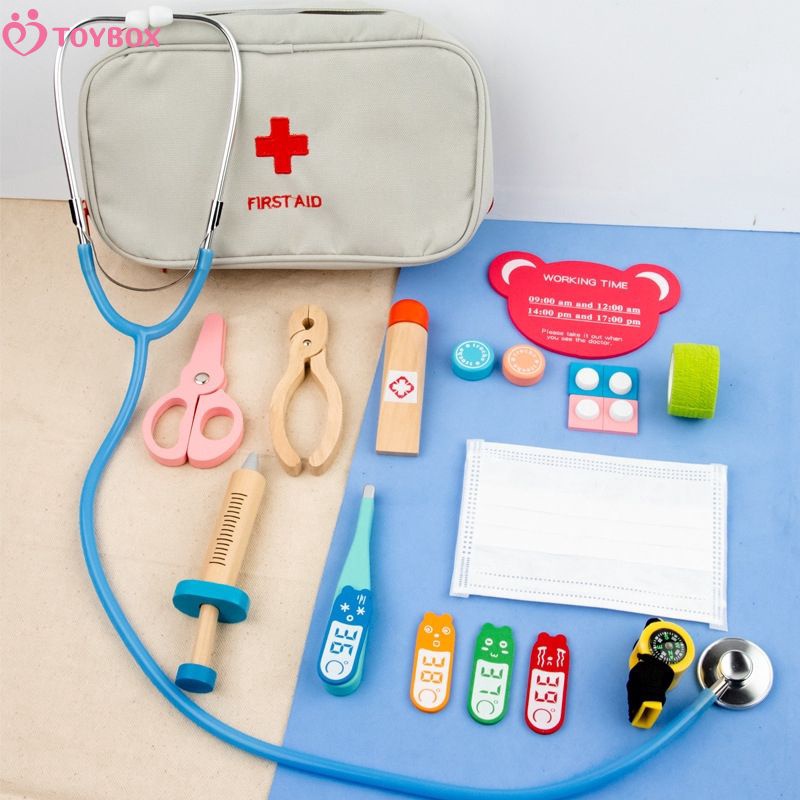 Safety Wooden Children Kids Outdoor Simulation First Aid Medical Kits Emergency Medicine Kit Doctor Early Learning to House Red Cloth Bag Set Toy Kid