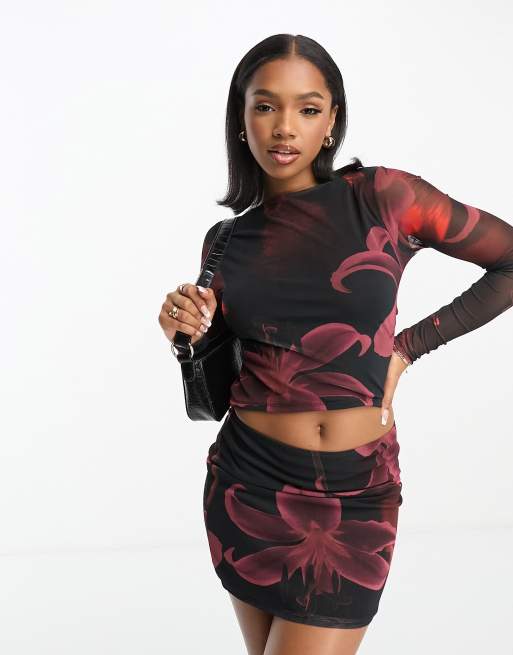 ASOS DESIGN printed floral mesh slash neck top co ord with back cut out