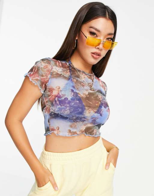 Blue Cherub Print Mesh Crop Top Tops Femme Luxe UK