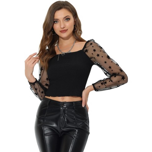 Allegra K Women s Square Neck Mesh Sheer Star Print Long Sleeve