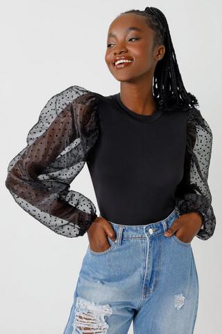 Women s Black Plus Mesh Puff Sleeve Crop Top Boohoo UK