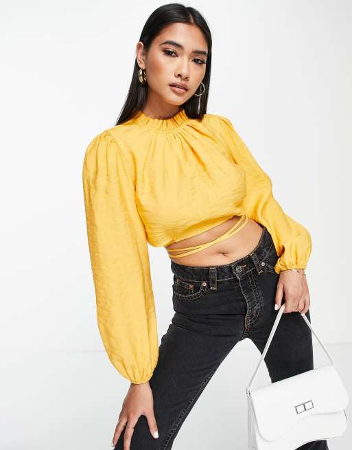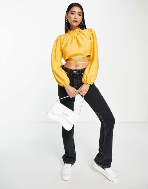 River Island linen crop top with tie detail in yellow ASOS