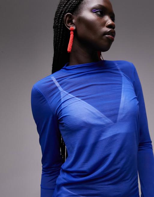 See Through Tops for Women Plain Mesh Blouse Crewneck Long Sleeve