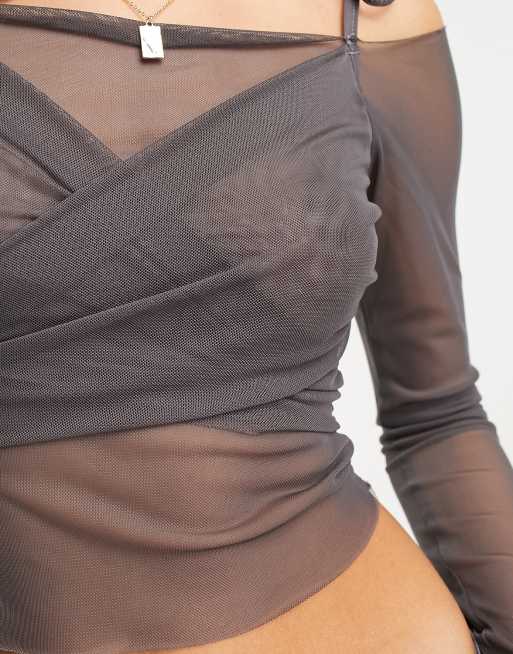 COLLUSION mesh ballet wrap around long sleeve top in gray