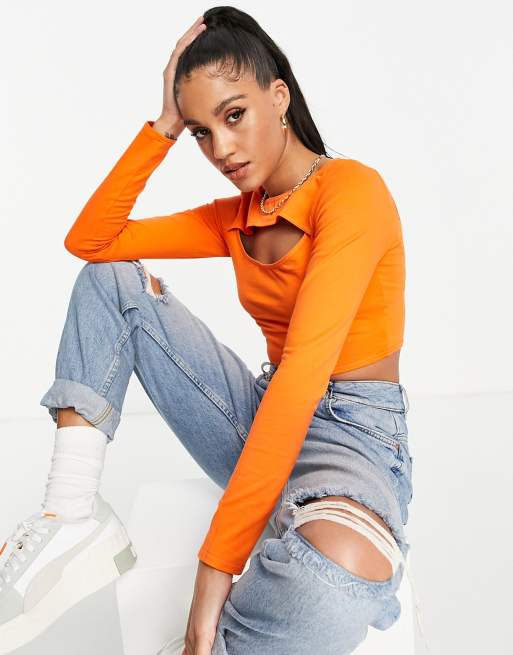 ASOS DESIGN long sleeve crop top with front cut out in orange ASOS