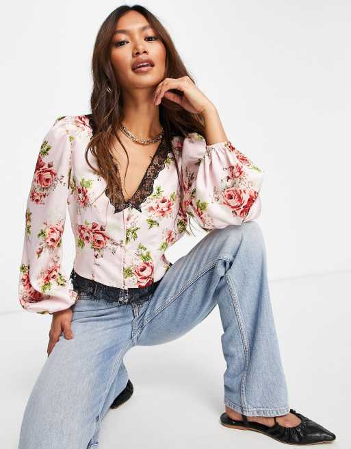 ASOS DESIGN lace trim satin blouse with seam detail in floral print