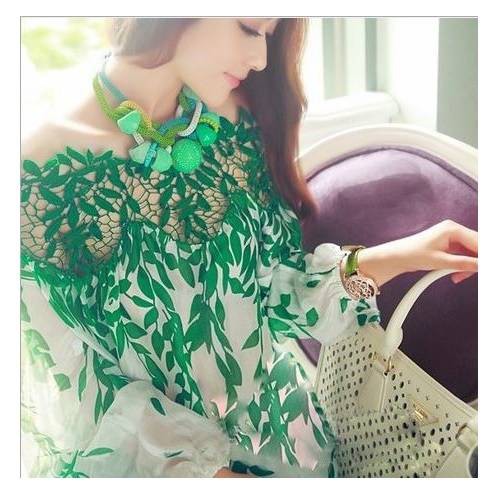 Women Hollow Lace Crochet Green Leaf Long Sleeve Loose Chiffon