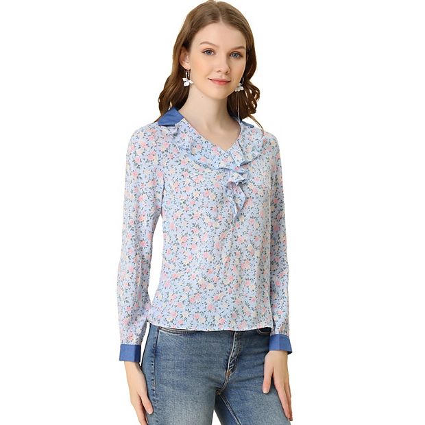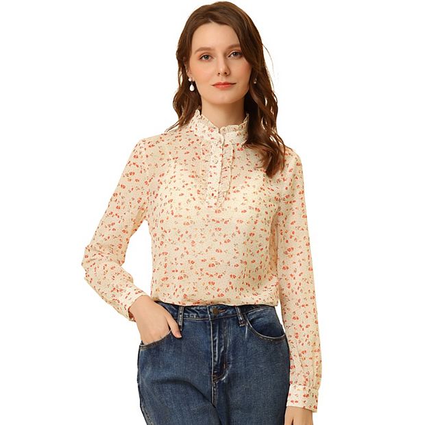 Women s Ruffled Neck Long Sleeve Button Up Semi Sheer Chiffon