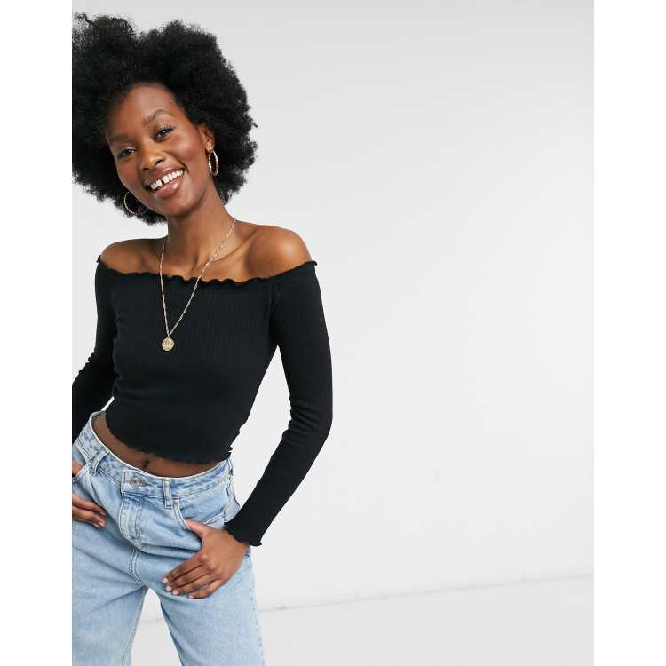 ASOS DESIGN off shoulder top with lettuce edge in rib in black