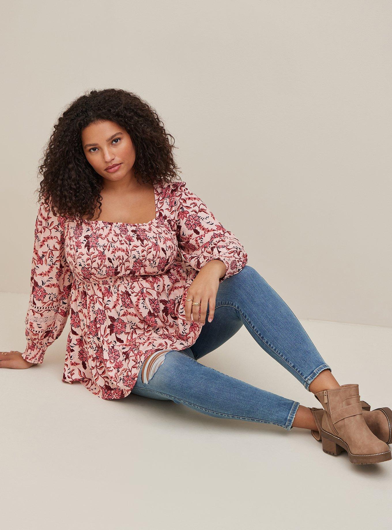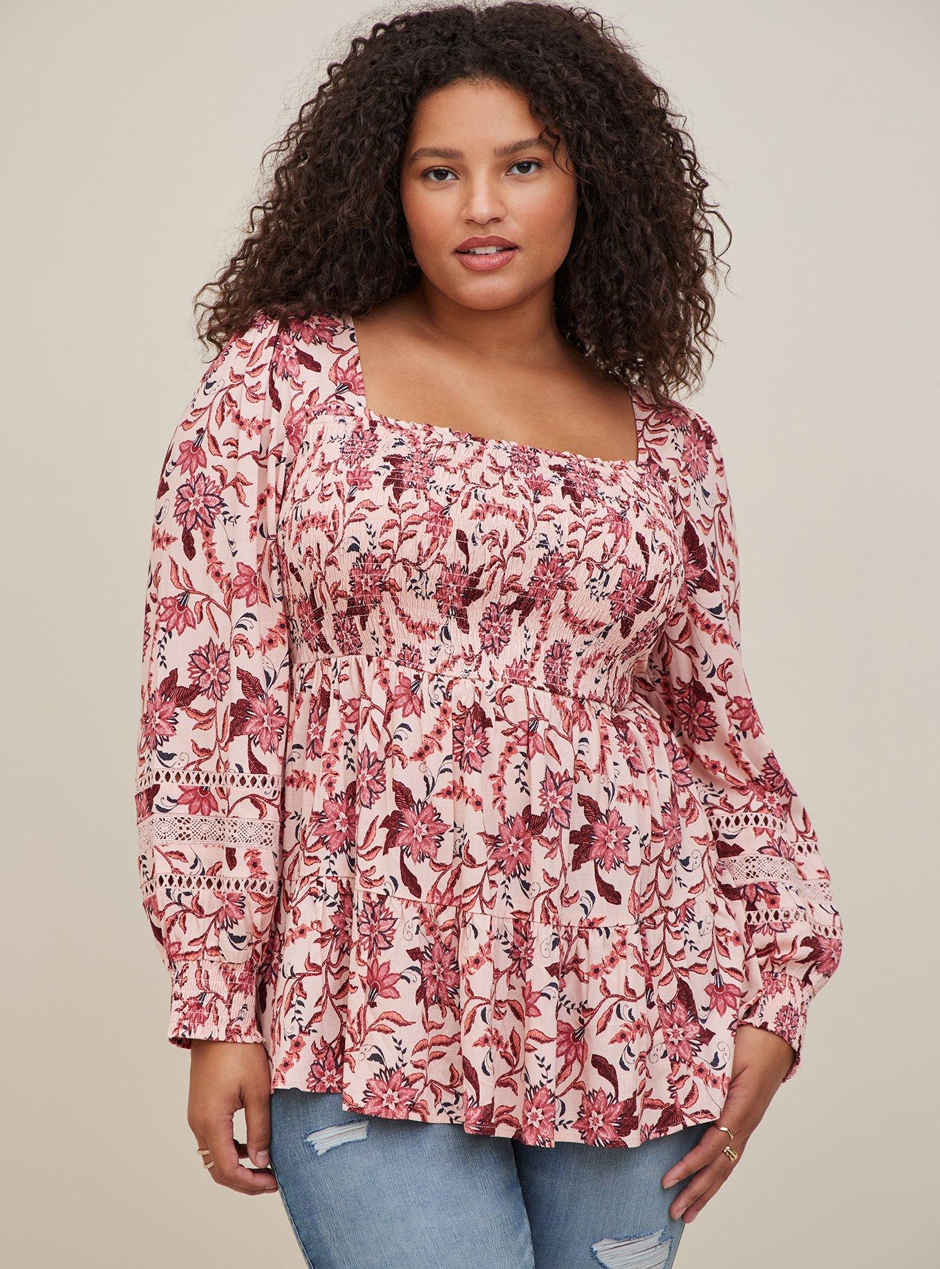 Plus Size Babydoll Rayon Slub With Lace Inset Smocked Tiered Top