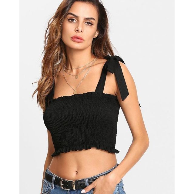 KAMISSY Women s Frill Smocked Crop Tank Top Tie Shoulder Strap Vest